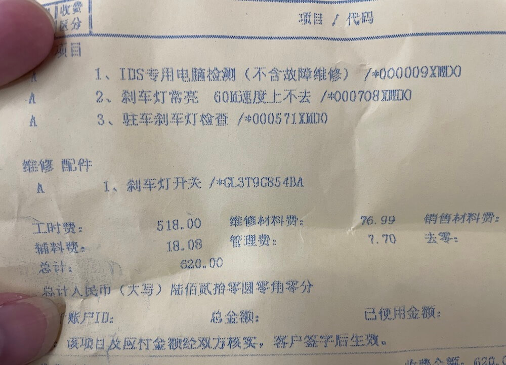 刹车故障直接影响行车安全,我丝毫不敢耽搁,第二天直接去 4S 店。跟网上说的一样,就更换了一个零件,70多块钱,但是工时费收了500多,总计620元。