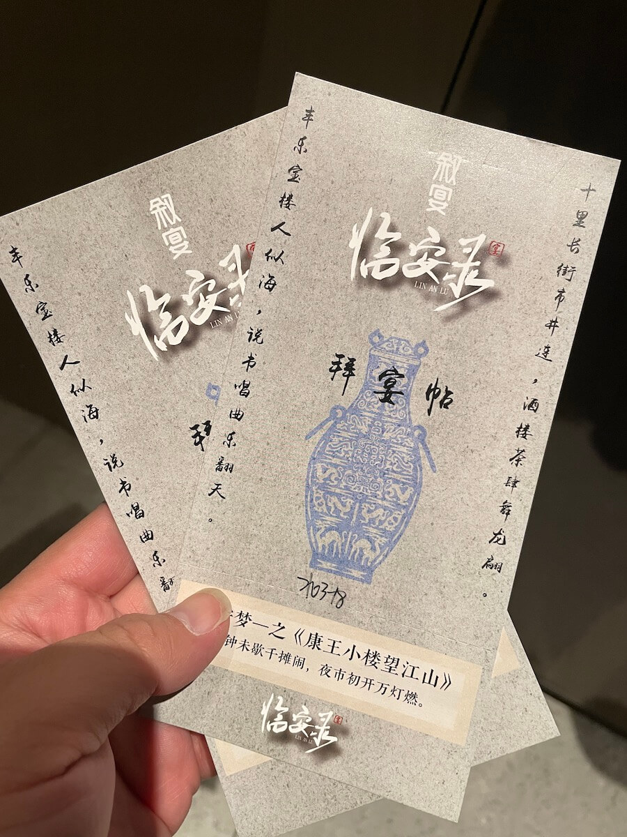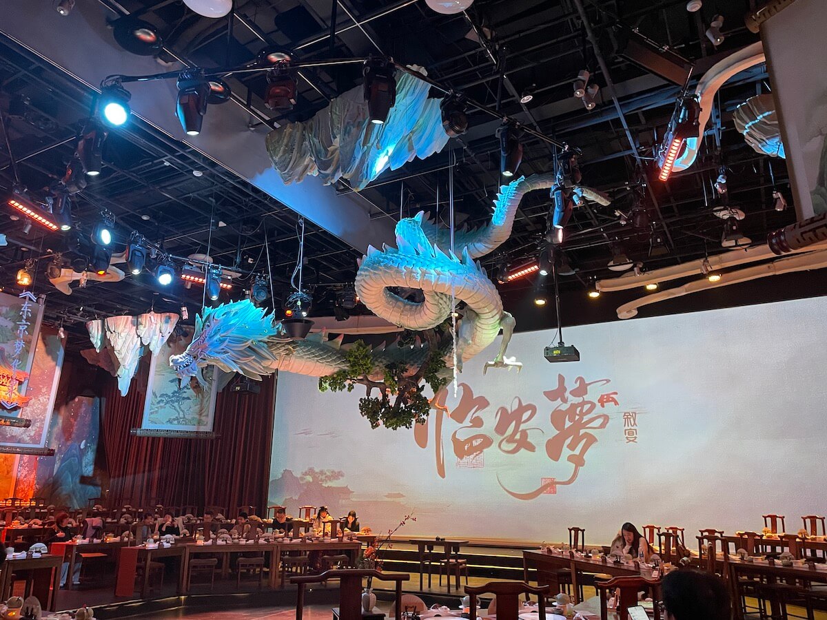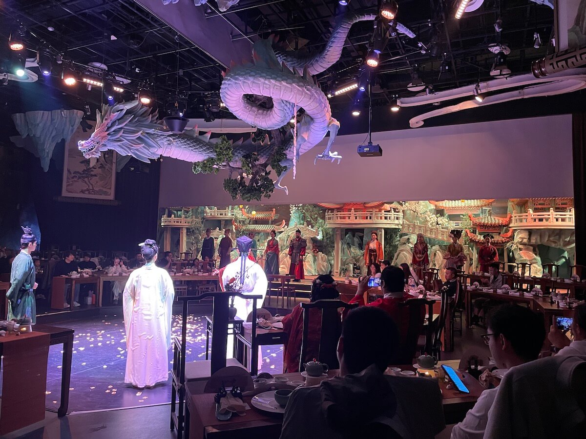 演出约一小时,每段节目结束后上一道菜。当然是预制菜,有几道菜过于鲜美,科技含量足。平心而论,演出和用餐都没有扣分项,但也不惊艳,没有硬菜。不过这么说的前提是,我是在抖音买的双人普通席(第三排往后),实付548元,偶尔带老婆二人世界一下是不错的。前面的 SVIP 席(第一排)两人要 980 元,VIP 席(第二排)两人要 780 元,那么我觉得不是很值。