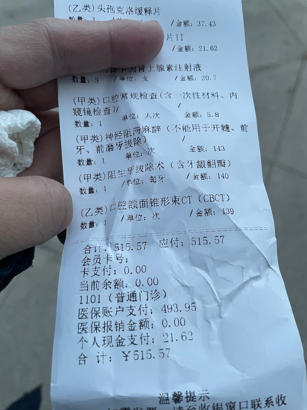 这次拔的是下牙,比上牙困难很多,所以整个过程耗时更久。在钻牙的时候我能闻到一股烧焦味,是最为恐怖的时刻。好在这个过程中医生不断言语安慰我,极大缓解了我的紧张。